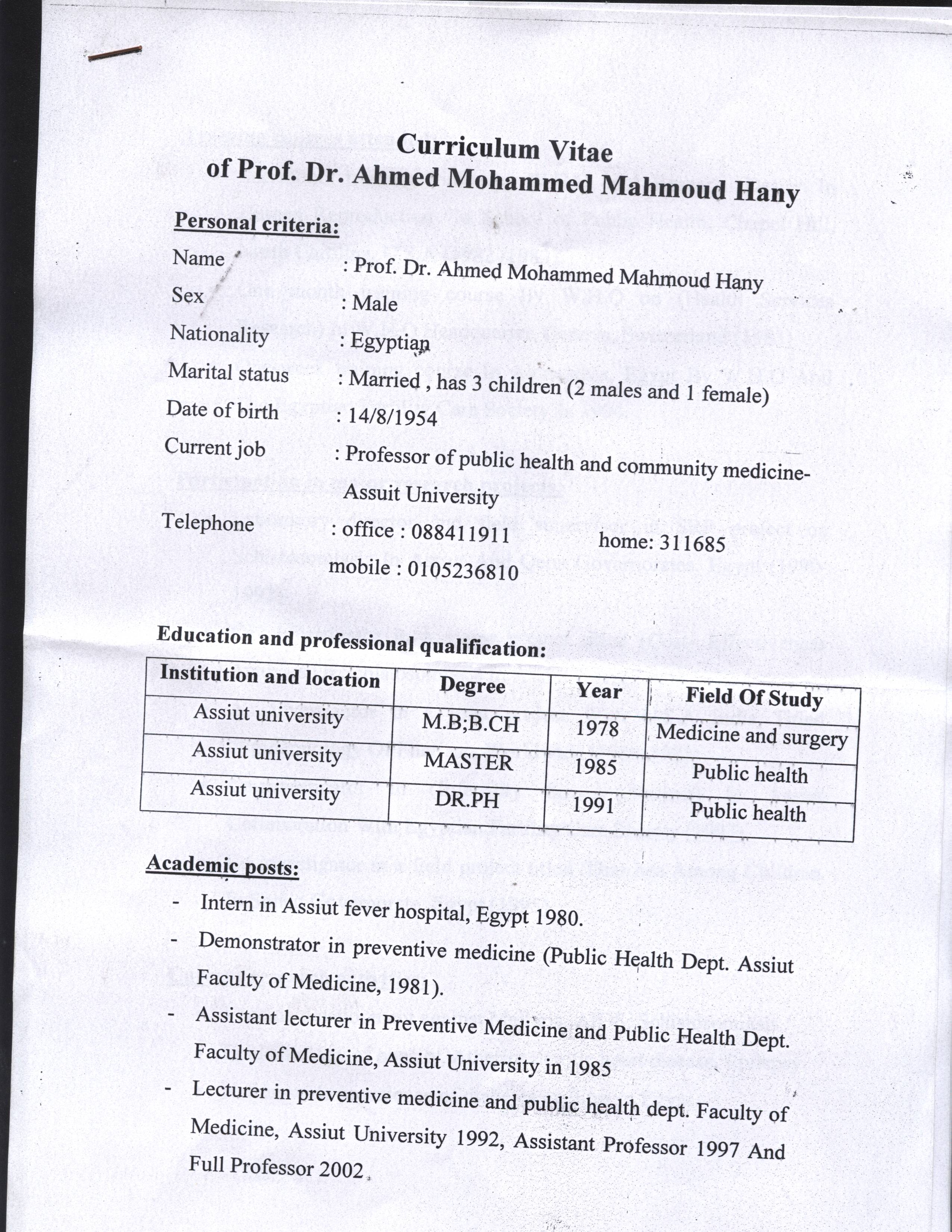 دكتوراه ﻒﻳ الصحة العامة (وبائيات الامراض المعدية) , كلية الطب جامعة اسيوط , 1991