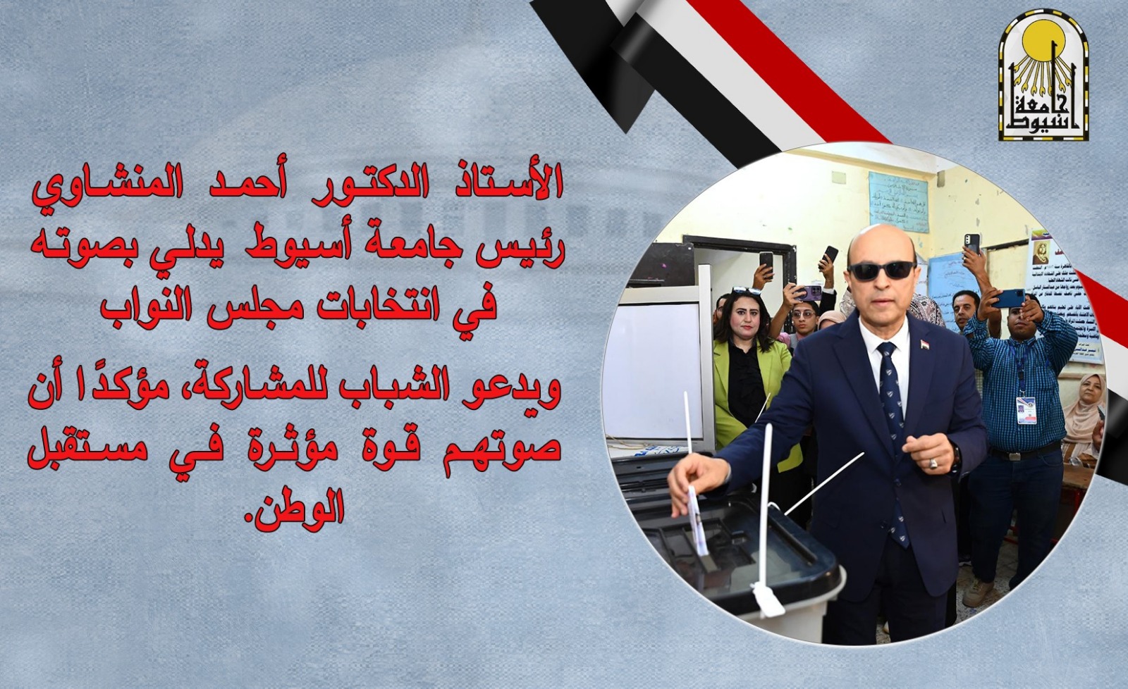 الأستاذ الدكتور أحمد المنشاوي، رئيس جامعة أسيوط، يدعو جميع المواطنين، والشباب خاصة، إلى المشاركة والإدلاء بأصواتهم في الانتخابات البرلمانية، مؤكدًا أن لكل صوت دور مهم في التنمية وبناء مستقبل الوطن.