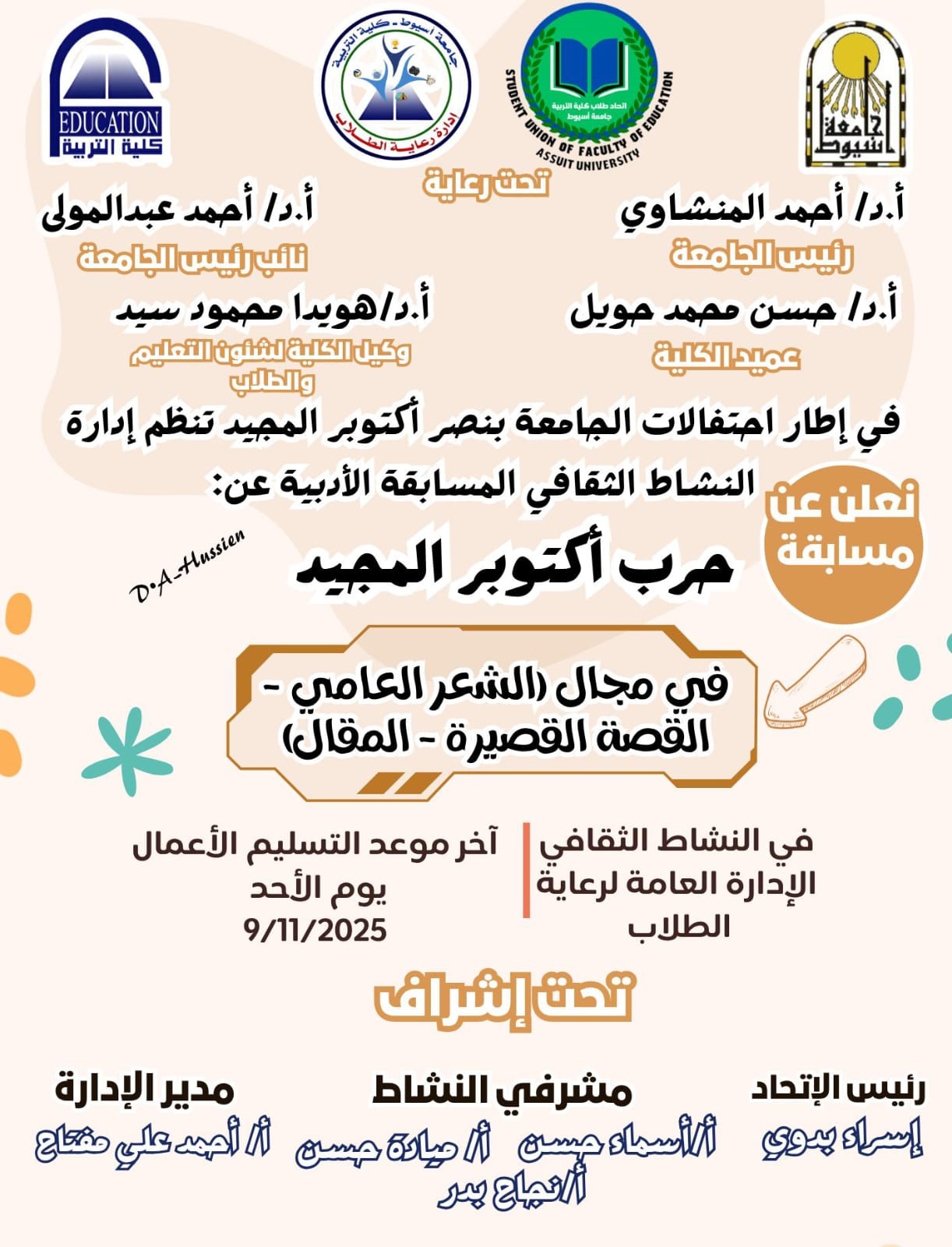 في إطار احتفاليات الجامعة بنصر أكتوبر المجيد تنظم إدارة النشاط الثقافي بالإدارة العامة لرعاية الطلاب المسابقة الثقافية في المجالات الآتية ( الشعر العامي، القصة القصيرة، المقال ) واخر تسليم الاعمال يوم الأحد نوفمبر9 نوفمبر 2025
