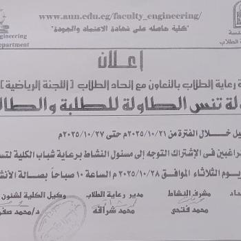 كلية الهندسة- الاعلان عن اقامة بطولة تنس الطاولة للطلبة والطالبات