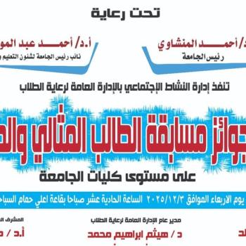 دعوة لحضور الطلاب والطالبات في حفل توزيع جوائز مسابقة الطالب المثالي والطالبة المثالية علي مستوى كليات الجامعة - إدارة النشاط الاجتماعي والرحلات بالإدارة العامة لرعاية الطلاب