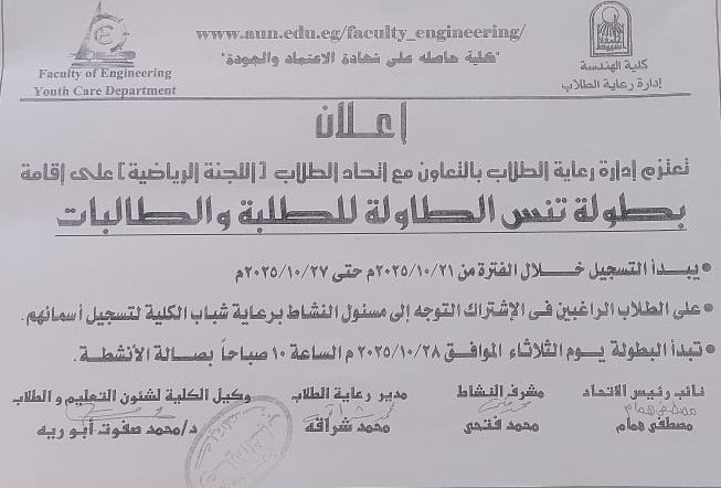 تعتزم إدارة رعاية الطلاب بكلية الهندسة بالتعاون مع اتحاد الطلاب (اللجنة الرياضية) على إقامة