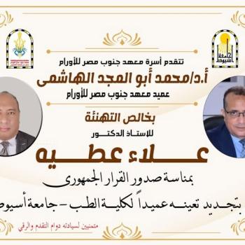 تتقدم اسرة معهد جنوب مصر للأورام بخالص التهنئة للاستاذ الدكتور / علاء عطية بمناسبة صدور القرار الجمهوري بتجديد تعيين سيادته عميداً لكلية الطب