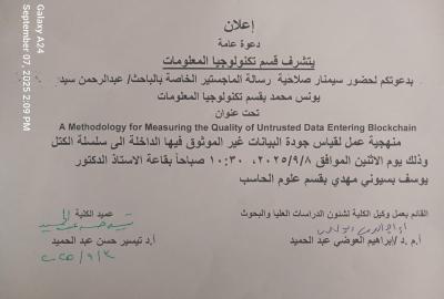 يعلن قسم نظم المعلومات عن انعقاد سمينار تسجيل نقطة البحث لدرجة الماجستير الخاصة / للباحث عبد الرحمن حسن محمد بقسم نظم المعلومات