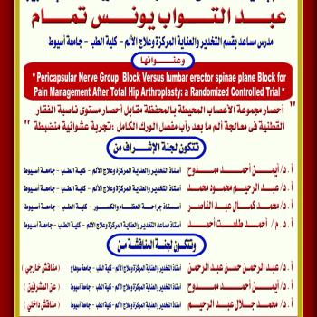 مناقشة رسالة الدكتوراه الخاصة بالطبيب / عبد التواب يونس تمام - مدرس مساعدبقسم التخدير والعناية المركزة وعلاج الآلم - كلية الطب - جامعة أسيوط