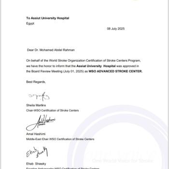 نتيجة لإلتزامها بتطبيق المعايير العالمية في طرق التشخيص والعلاج .... وحدة السكتة الدماغية بمستشفى الأمراض العصبية والنفسية وجراحة المخ والأعصاب بجامعة أسيوط تحصل على الاعتماد الدولي كوحدة متقدمة من المنظمة العالمية للسكتة الدماغية