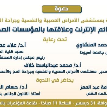٣١ ديسمبر ... مستشفى الأمراض العصبية والنفسية وجراحة المخ والأعصاب بكلية الطب جامعة أسيوط ينظم ندوة عن جرائم الإنترنت وعلاقتها بالمؤسسات الصحية