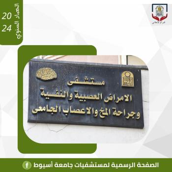 في حصادها السنوي لعام 2024م مستشفيات جامعة أسيوط تعلن عن استقبال مستشفى الأمراض العصبية والنفسية وجراحة المخ والأعصاب (13312) حالة بمختلف عياداته، (8538) حالة من مختلف المحافظات