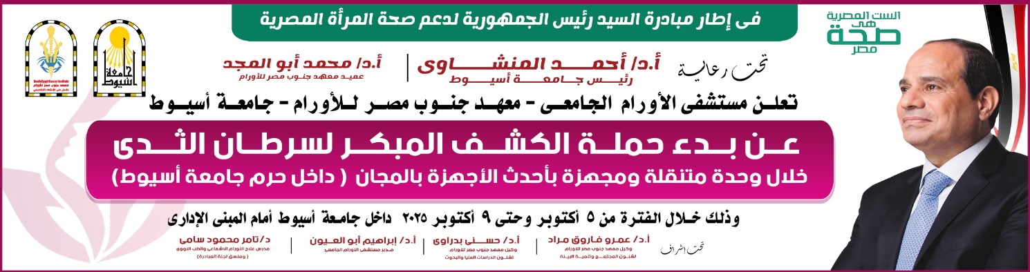 أعلنت جامعة أسيوط عن إطلاق حملة الكشف المبكر لسرطان الثدي بالمجان لجميع السيدات بمحافظة أسيوط، خلال الفترة من 5 وحتى 9 أكتوبر الجاري، وذلك في إطار مبادرة السيد رئيس الجمهورية لدعم صحة المرأة المصرية.