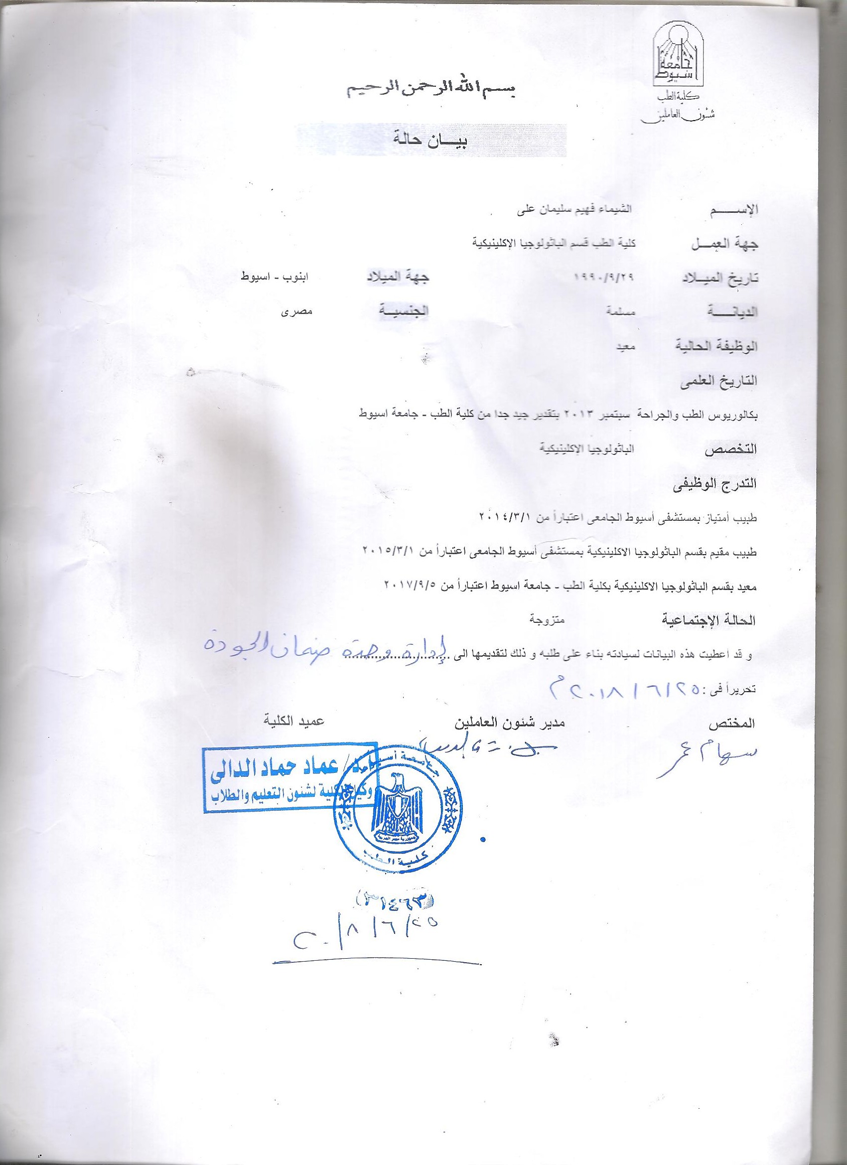 B. Sc. In Physcian (Clinical pathologist) , Faculty of medicine Assiut University , 2013