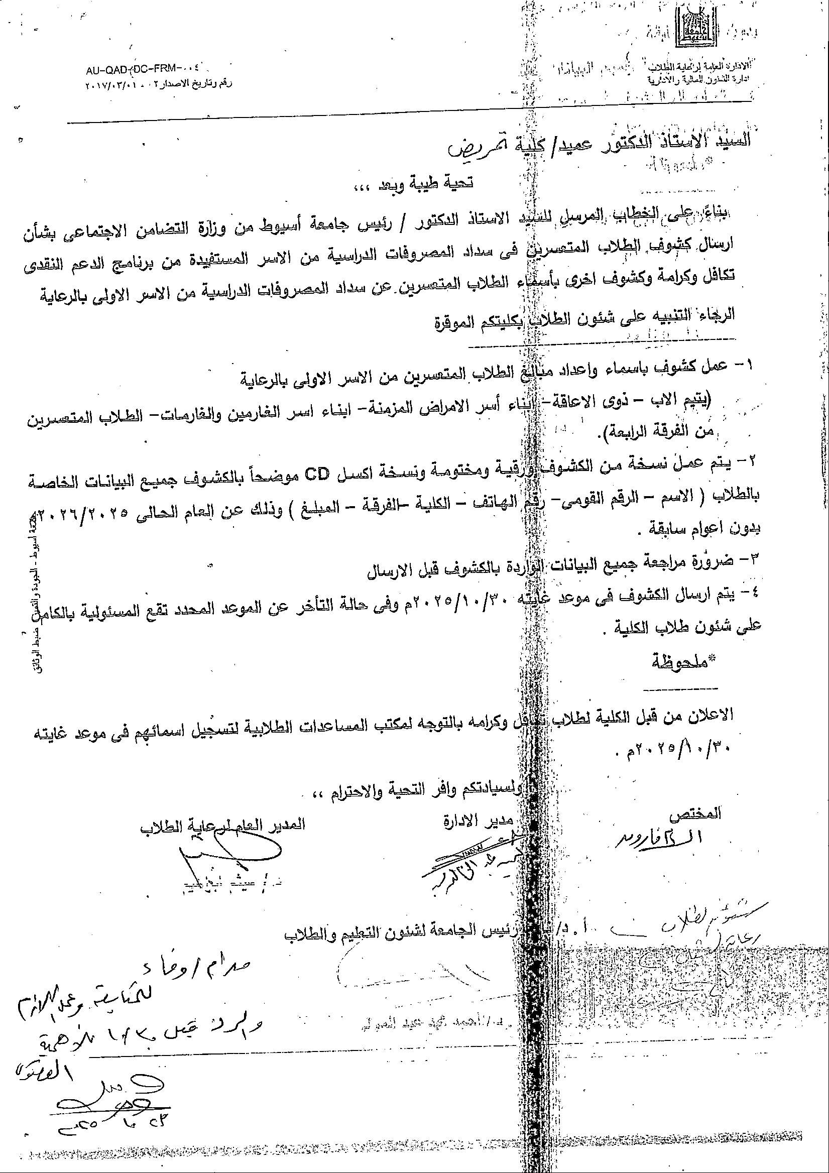 Announcement to students enrolled in the Takaful and Karama program: Please go to the Student Aid Office to register your names by October 30, 2025.