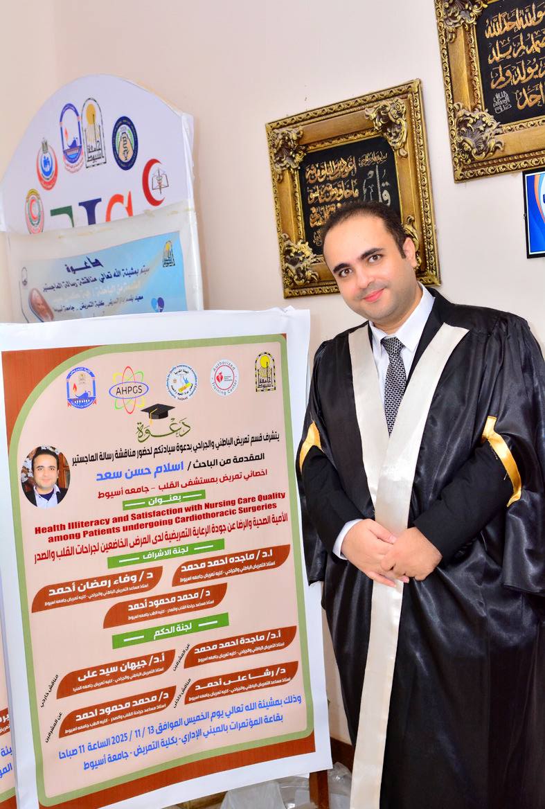 تهنئة بمناقشة رسالة الماجستير تتقدم كلية التمريض – جامعة أسيوط بخالص التهنئة للباحث/ إسلام حسن سعد أخصائي تمريض بمستشفى القلب – جامعة أسيوط وذلك بمناسبة مناقشة رسالة الماجستير الخاصة به