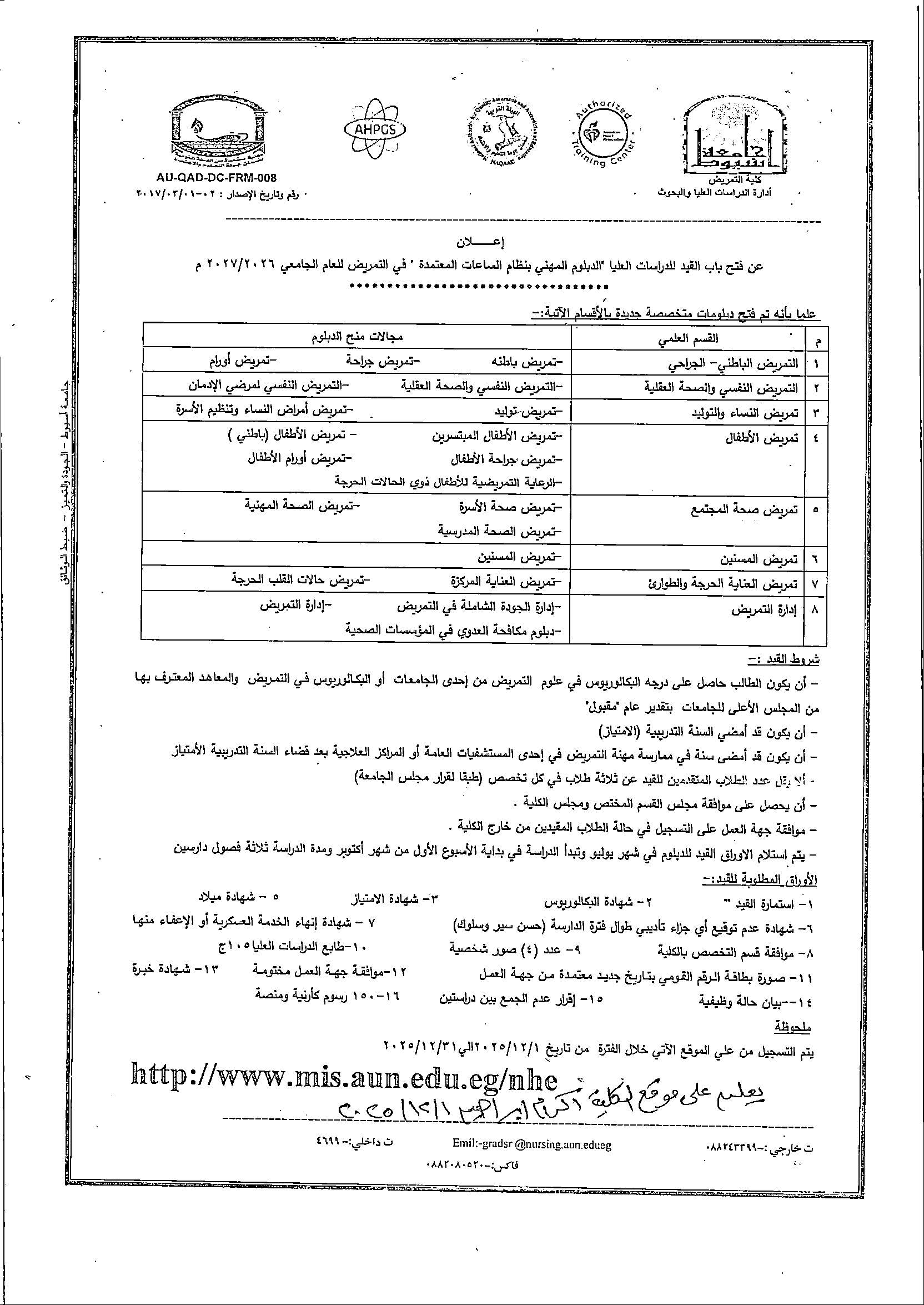 إعلان عن فتح باب القيد للدراسات العليا لدرجة "الدبلوم المهني بنظام الساعات المعتمدة " في التمريض للعام الجامعي 2025-2026م