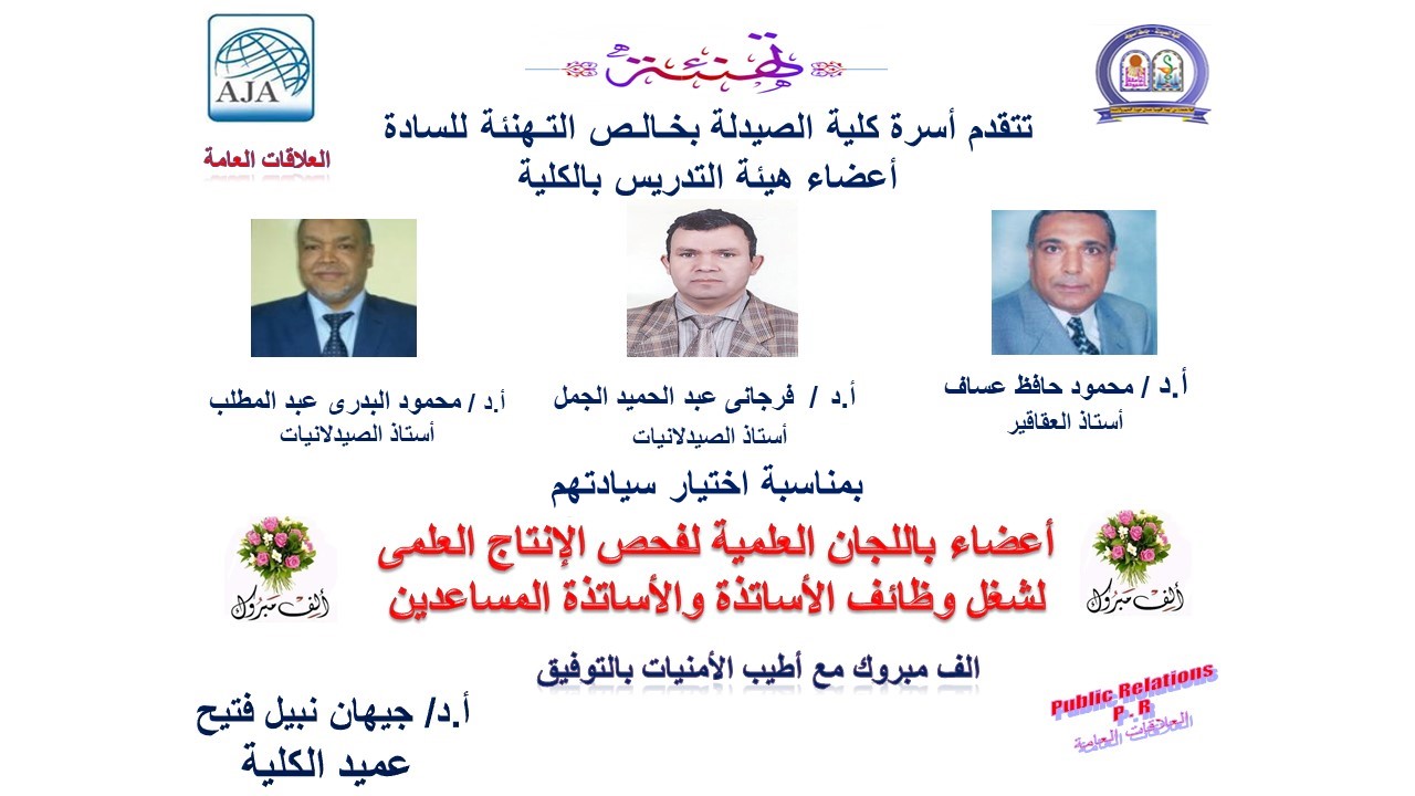 تهنئة باختيار أعضاء هيئة تدريس كلية الصيدلة ضمن اللجان العلمية لفحص الإنتاج العلمي