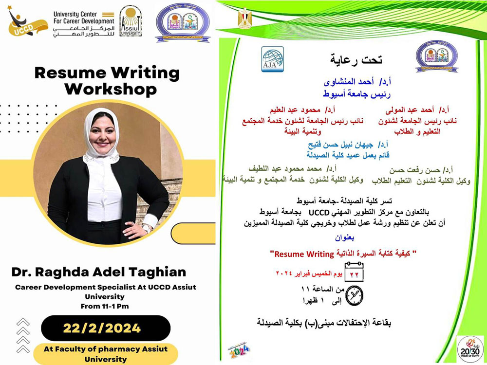 تسر كلية الصيدلة – جامعة أسيوط بالتعاون مع مركز التطوير المهني UCCD بجامعة أسيوط ان تعلن عن تنظيم ورشة عمل لطلاب وخريجي كلية الصيدلة المميزين بعنوان " كيفية كتابة السيرة الذاتية Resume Writing" يوم الخميس 22 فبراير 2024