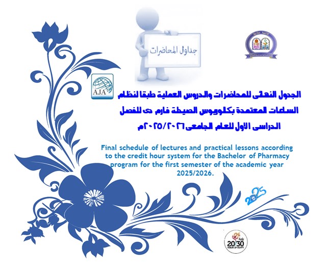 Final schedule of lectures and practical lessons according to the credit hour system for the Bachelor of Pharmacy program for the first semester of the academic year 2025/2026.