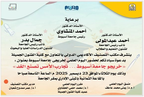 تتشرف جامعة أسيوط بدعوة السادة عمداء ووكلاء الكليات والسادة أعضاء هيئة التدريس والباحثين وخريجى جامعة أسيوط لحضور اليوم العلمي لخريجي جامعة أسيوط،