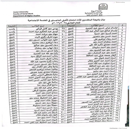 The Faculty of Social Work extends its sincerest congratulations to its students who have successfully passed the entrance exam for the PhD preparatory program. We wish them continued success and fulfillment in their academic and research endeavors, and hope they will achieve further excellence and contributions that serve the community and contribute to achieving the Sustainable Development Goals and Egypt's Vision 2030.