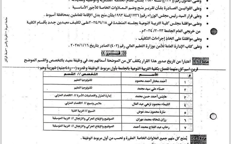 Prof. Dr. Yasmine El-Kahky, Dean of the Faculty of Specific Education in Assiut, extended his sincere thanks and appreciation to Prof. Dr. Ahmed El-Menshawy, President of Assiut University, for issuing his decision to appoint the new teaching assistants