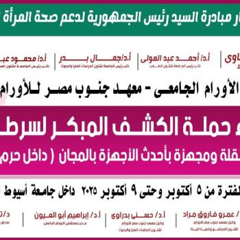 الإعلان عن بدء حملة للكشف المبكر عن سرطان الثدي بالمجان في الفترة من 5 -9 أكتوبر 2025 داخل حرم جامعة أسيوط