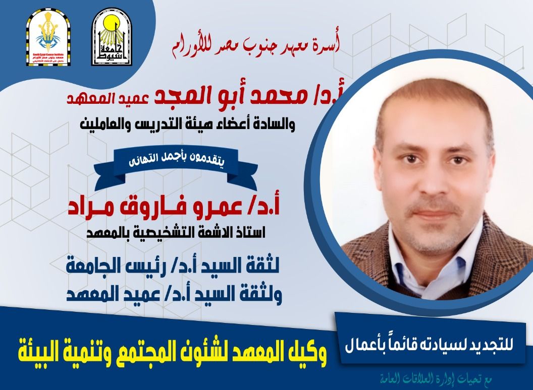 تهنئة مقدمة من السيد أ.د/محمد ابوالمجد عميد المعهد وأعضاء هيئة التدريس والعاملين بتجديد تكليف الدكتور عمرو فاروق مراد، للقيام بأعمال وكيل المعهد لشئون خدمة المجتمع وتنمية البيئة