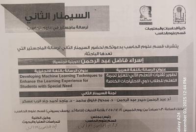 Invitation to attend the seminar on the validity of the Master's thesis of researcher/Asaad Nasrallah Ismail, teaching assistant in the Information Technology Department