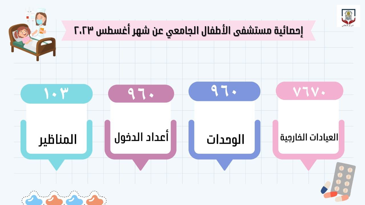 أعلن مستشفى الأطفال الجامعي، عن استقباله (٧٦٧٠) حالة مترددة على العيادات الخارجية، خلال شهر أغسطس الماضي، تحت رعاية الدكتور أحمد المنشاوي رئيس جامعة أسيوط، والدكتور علاء عطية عميد كلية الطب ورئيس مجلس إدارة المستشفيات الجامعية، والدكتور إيهاب فوزي المدير التنفيذي للمستشفيات الجامعية، والدكتور محمد أمير مدير المستشفى.