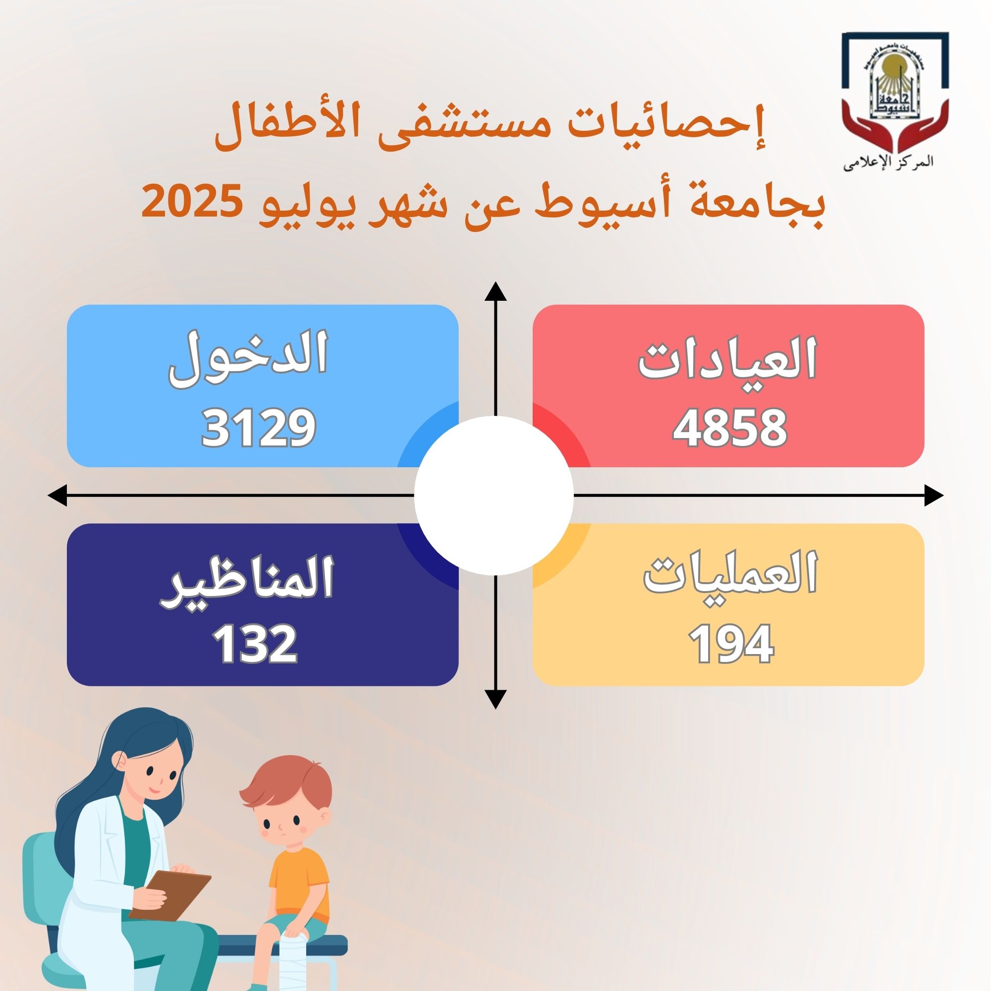 Assiut University Children's Hospital received 4,858 patients at its various clinics during July, under the auspices of Professor Ahmed El-Minshawy, President of the University; Professor Alaa Attia, Dean of the Faculty of Medicine and Chairman of the Board of Directors of University Hospitals; and Professor Yasser Farouk, Director
