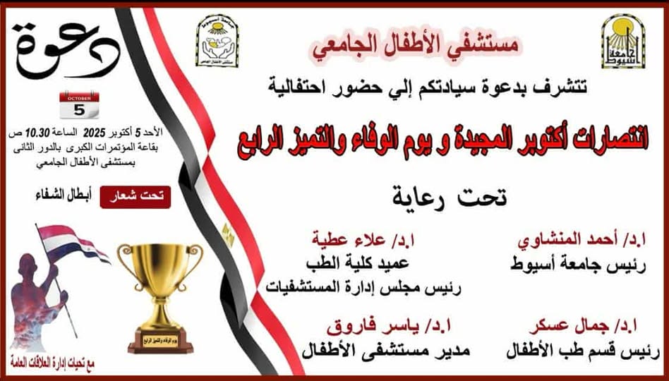 ينظم مستشفى الأطفال بجامعة أسيوط احتفالية يوم الوفاء والتميز الرابع، تزامناً مع إحياء ذكرى انتصارات أكتوبر المجيدة، تحت شعار " أبطال الشفاء"، وذلك تحت رعاية الأستاذ الدكتور أحمد المنشاوي رئيس الجامعة، والأستاذ الدكتور علاء عطيه عميد كلية الطب ورئيس مجلس إدارة المستشفيات الجامعية، والأستاذ الدكتور جمال عسكر رئيس قسم طب الأطفال، والأستاذ الدكتور ياسر فاروق مدير مستشفى الأطفال.