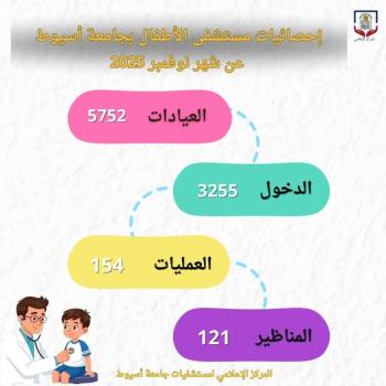 مستشفى الأطفال بجامعة أسيوط يستقبل (5359) حالة بعياداته الخارجية خلال أكتوبر الماضي
