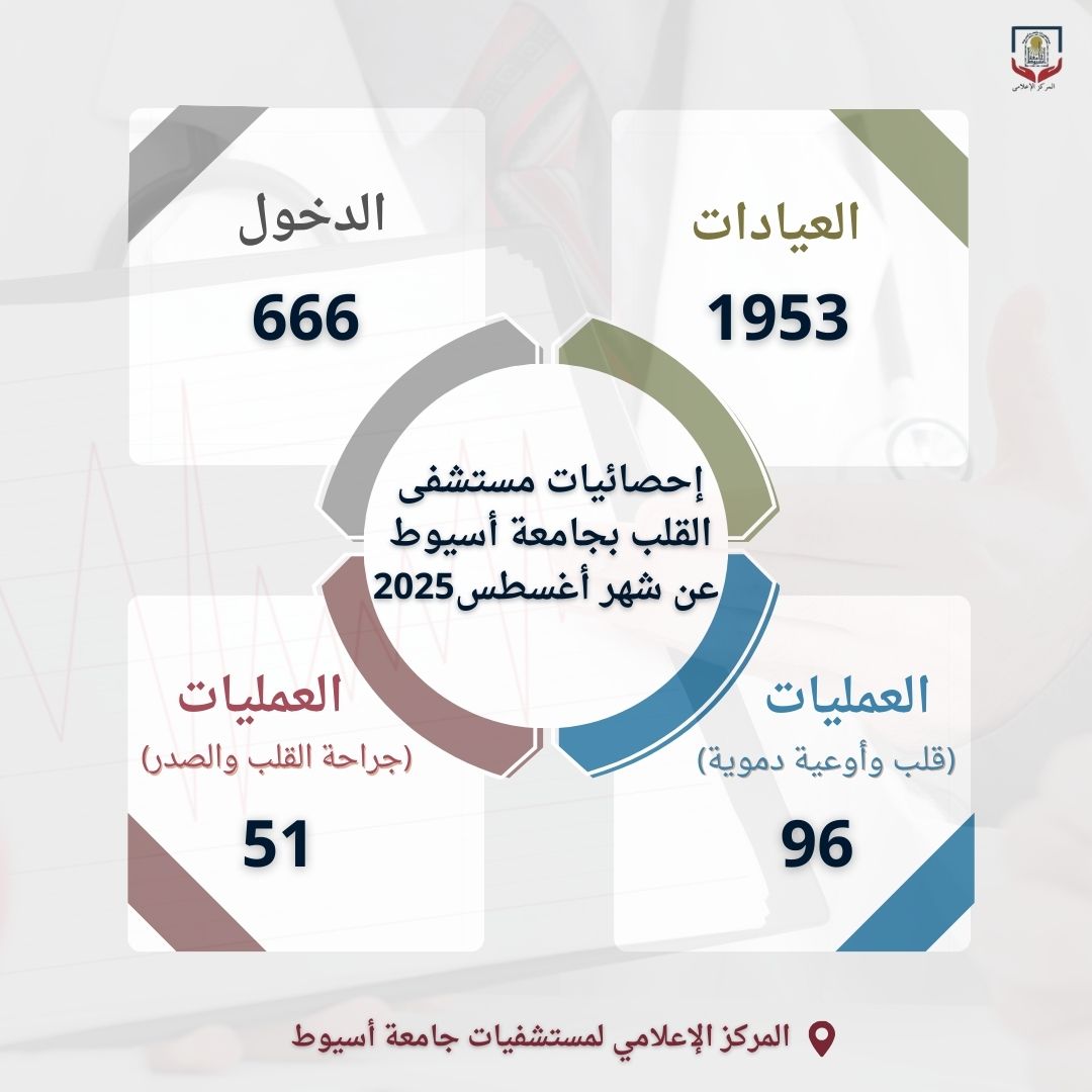 Assiut University Heart Hospital received (1953) visitors to its outpatient clinics during the past month of August. This was under the patronage of Professor Dr. Ahmed El-Menshawy, President of Assiut University; Professor Dr. Alaa Attia, Dean of the Faculty of Medicine and Chairman of the Hospitals Board; and Professor Dr. Mohamed Ayad, Director of the Hospital.