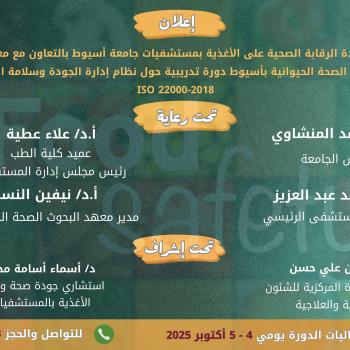 وحدة الرقابة الصحية على الأغذية بمستشفيات جامعة أسيوط تنظم دور تدريبية بالتعاون مع معهد بحوث الصحة الحيوانية حول معايير سلامة الغذاء