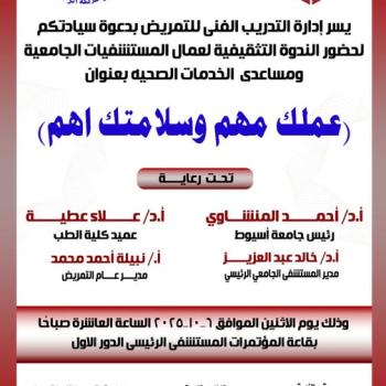 غدا.. "عملك مهم وسلامتك أهم" في ندوة تثقيفية لمساعدي الخدمات الصحية بمستشفيات جامعة أسيوط