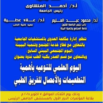 ٧ أكتوبر .. إدارة مكافحة العدوى بمستشفيات جامعة أسيوط تعقد ندوة علمية حول التوعية بأهمية التطعيمات والأمصال للفرق الطبية