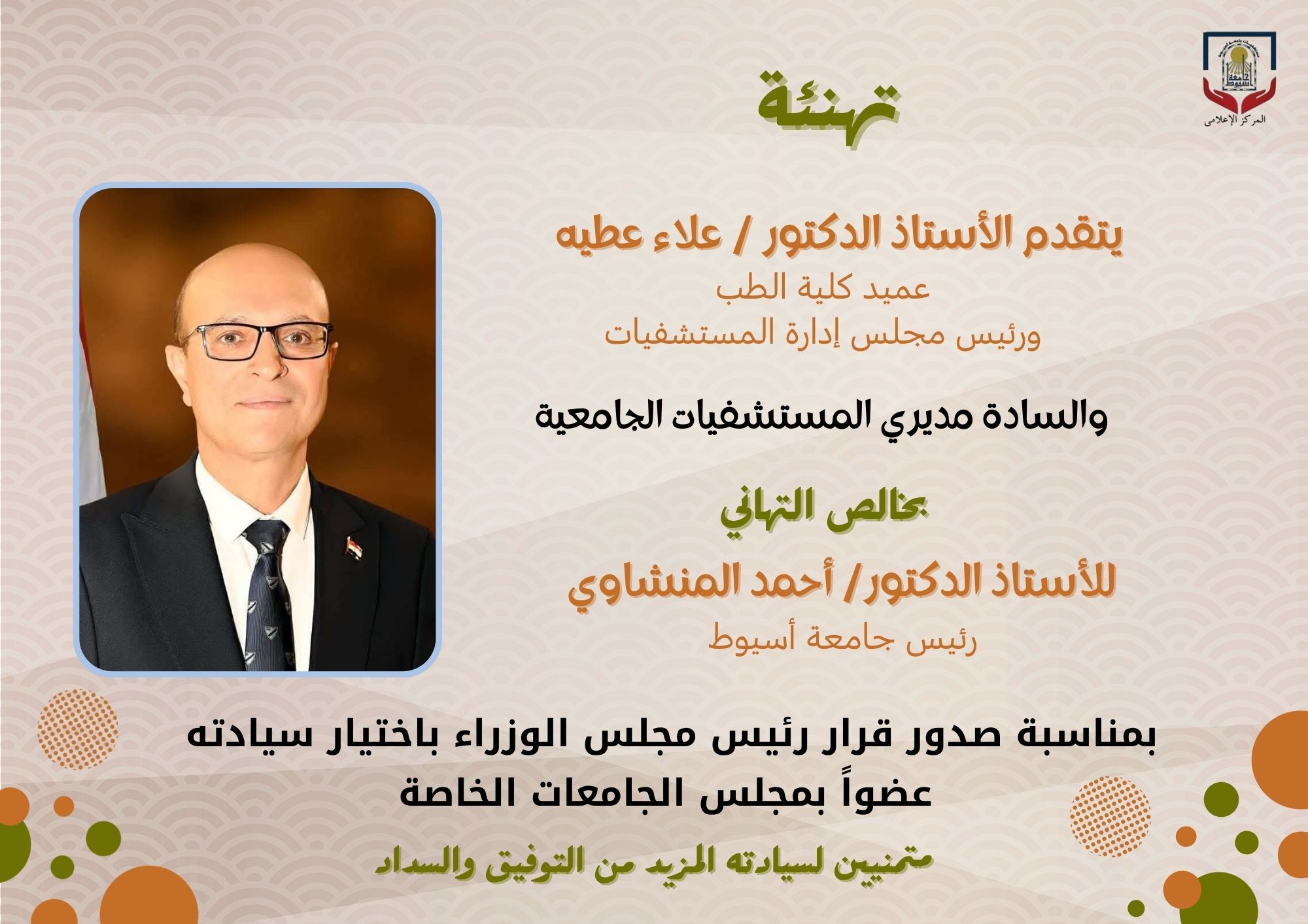 الأستاذ الدكتور علاء عطية عميد كلية الطب بجامعة أسيوط ورئيس مجلس إدارة المستشفيات الجامعية يشارك باجتماع المجلس الأعلى للمستشفيات الجامعية