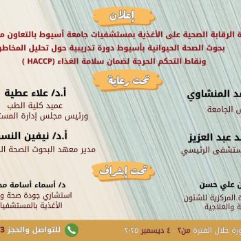 ٢ ديسمبر .. وحدة الرقابة الصحية على الأغذية بمستشفيات جامعة أسيوط تنظم دورة تدريبية حول تحليل…