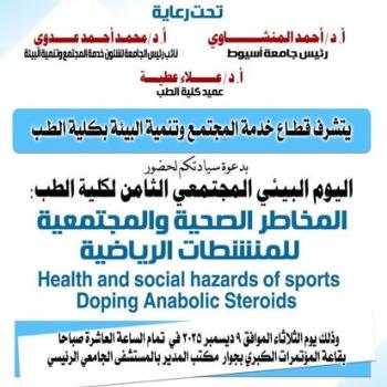 ٩ ديسمبر .... كلية الطب تناقش المخاطر الصحية والمجتمعية للمنشطات الرياضية في اليوم البيئي المجتمعي…
