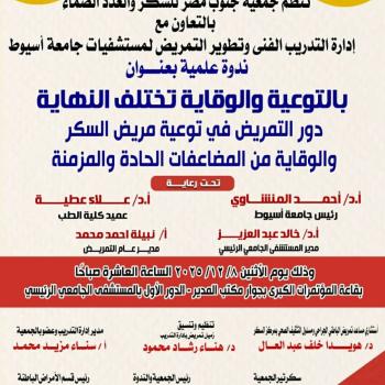 ٨ ديسمبر .... إدارة التدريب الفني وتطوير التمريض بمستشفيات جامعة أسيوط تنظم ندوة تثقيفية بالتعاون مع جمعية جنوب مصر للسكر والغدد الصماء حول دور التمريض في توعية مرضى السكر