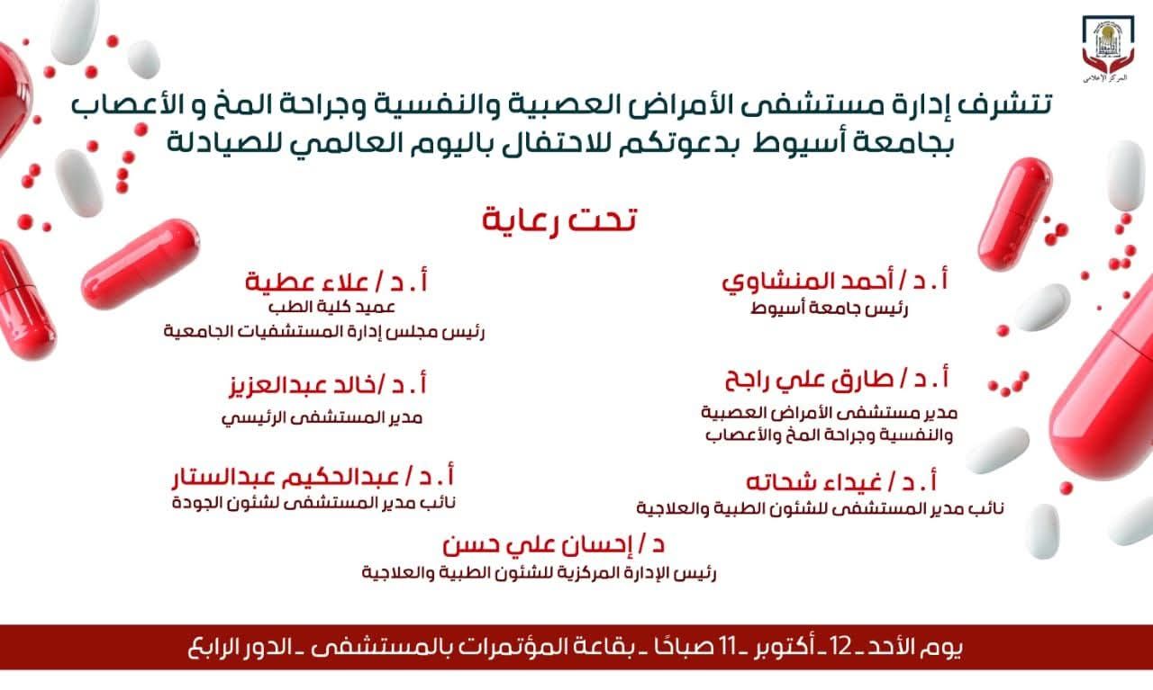 ينظم مستشفى الأمراض العصبية والنفسية وجراحة المخ والأعصاب بجامعة أسيوط احتفالية اليوم العالمي للصيادلة، وذلك يوم الأحد الموافق ١٢ أكتوبر، تحت رعاية الأستاذ الدكتور أحمد المنشاوي، رئيس الجامعة، والأستاذ الدكتور علاء عطيه، عميد كلية الطب ورئيس مجلس إدارة المستشفيات الجامعية، والأستاذ الدكتور طارق علي راجح، مدير مستشفى الأمراض العصبية والنفسية وجراحة المخ والأعصاب، والأستاذ الدكتور خالد عبد العزيز مدير المستشفى الرئيسي، والأستاذة الدكتورة غيداء شحاتة، نائب مدير المستشفى للشئون الطبية والعلاجية، والأستاذ الدكتور عبد الحكيم عبد الستار، نائب مدير المستشفى لشئون الجودة، والدكتورة إحسان علي حسن، رئيس الإدارة المركزية للشئون الطبية والعلاجية، وبتنظيم من الدكتورة راندا حسني، مدير إدارة التموين الطبي والصيدليات بمستشفى الأمراض العصبية والنفسية وجراحة المخ والأعصاب.
