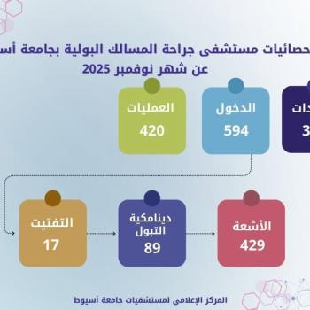 مستشفيات جامعة أسيوط تستعرض حصادها النصف سنوي ... وتعلن عن استقبال مستشفى جراحة المسالك بجامعة أسيوط (20598) مترددا بمختلف عياداته خلال الفترة من 1 يناير 2025 إلى 30 يونيو 2025م