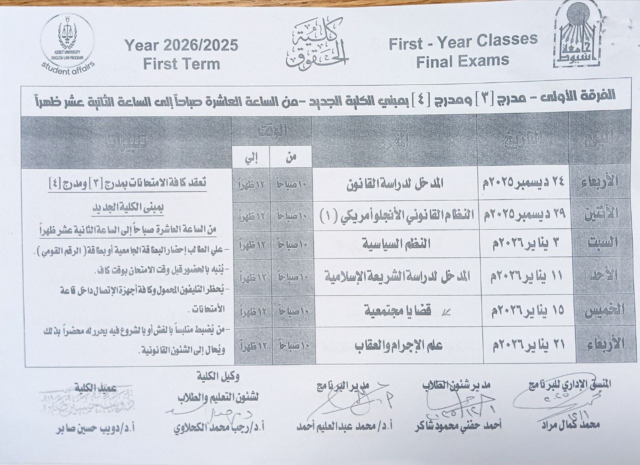 جدول امتحانات الفرقة الأولى برنامج الليسانس باللغة الانجليزية الفصل الدراسي الأول للعام الجامعي 2025 / 2026
