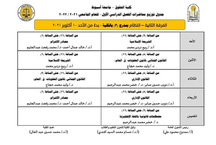 * جداول توزيع محاضرات الفصل الدراسي الأول لبرنامج حقوق باللغة الإنجليزي ، للعام الجامعي 2021/2022:-