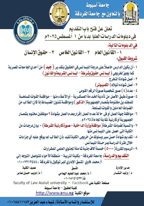 To download the study materials for the Faculty of Law, Assiut University, for the four years, in Arabic and English.