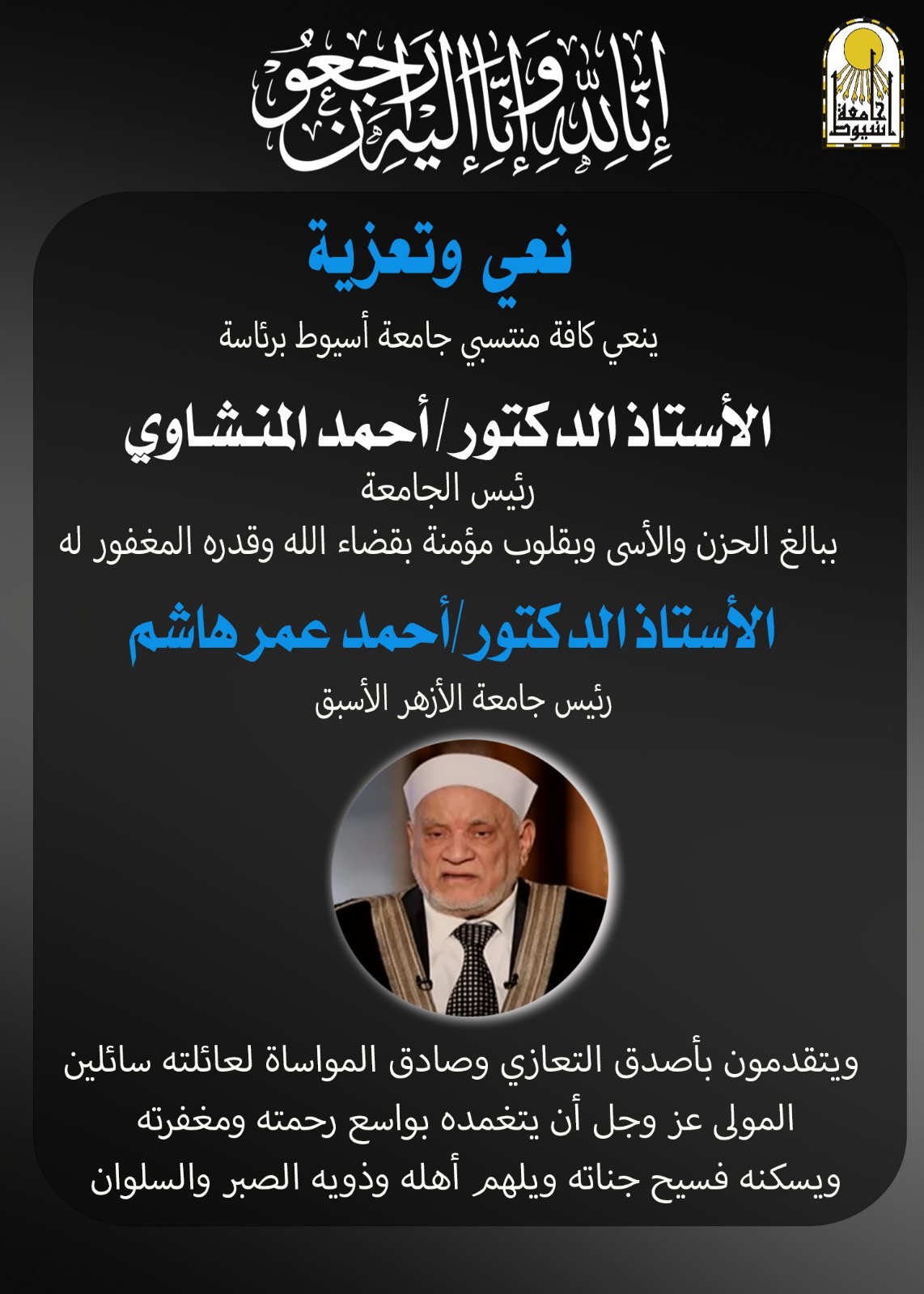 نعى الدكتور أحمد المنشاوي، رئيس جامعة أسيوط، ببالغ الحزن والأسى، العالم الجليل الدكتور أحمد عمر هاشم، عضو هيئة كبار العلماء بالأزهر الشريف، وأستاذ الحديث وعلومه، ورئيس جامعة الأزهر الأسبق، الذي وافته المنية بعد مسيرة حافلة بالعطاء العلمي والدعوي.