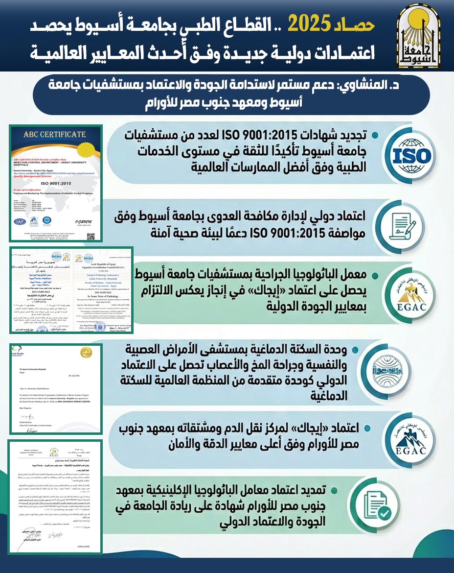 حصاد 2025 .. القطاع الطبي بجامعة أسيوط يحصد اعتمادات دولية جديدة وفق أحدث المعايير العالمية ويرسّخ ثقافة الجودة