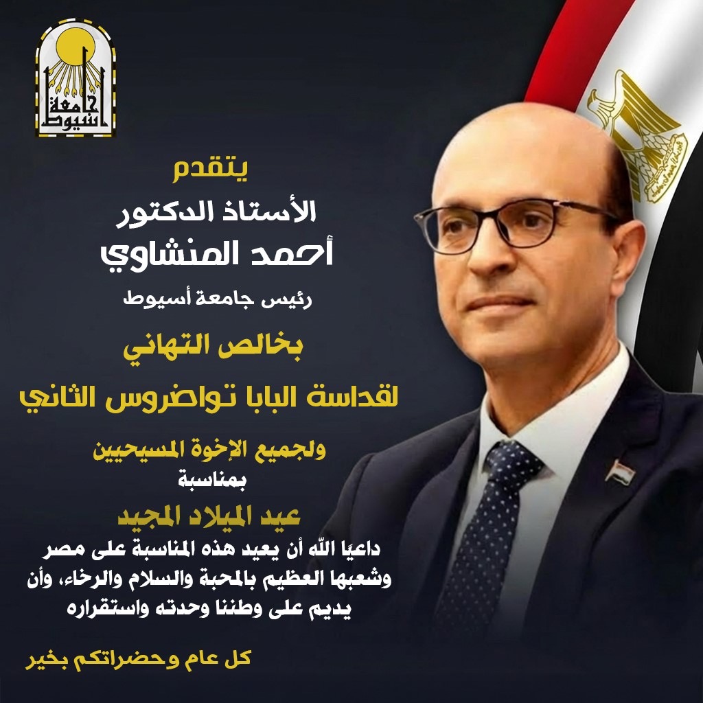 رئيس جامعة أسيوط يهنئ قداسة البابا تواضروس الثاني والإخوة المسيحيين بعيد الميلاد المجيد