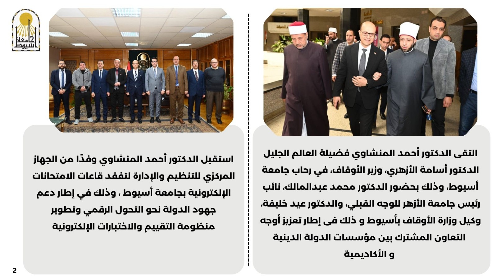 • التقى الدكتور أحمد المنشاوي فضيلة العالم الجليل الدكتور أسامة الأزهري، وزير الأوقاف، في رحاب جامعة أسيوط، وذلك بحضور الدكتور محمد عبدالمالك، نائب رئيس جامعة الأزهر للوجه القبلي، والدكتور عيد خليفة، وكيل وزارة الأوقاف بأسيوط، وذلك في إطار تعزيز أوجه التعاون المشترك بين مؤسسات الدولة الدينية والأكاديمية.