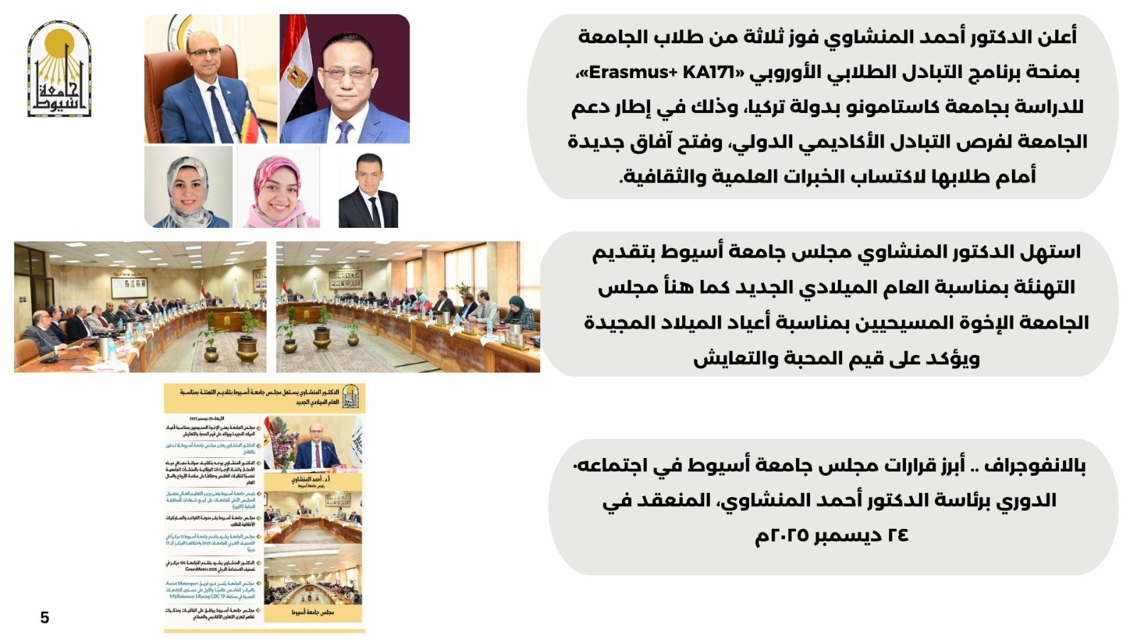 • استهل الدكتور المنشاوي مجلس جامعة أسيوط بتقديم التهنئة بمناسبة العام الميلادي الجديد كما هنأ مجلس الجامعة الإخوة المسيحيين بمناسبة أعياد الميلاد المجيدة ويؤكد على قيم المحبة والتعايش.