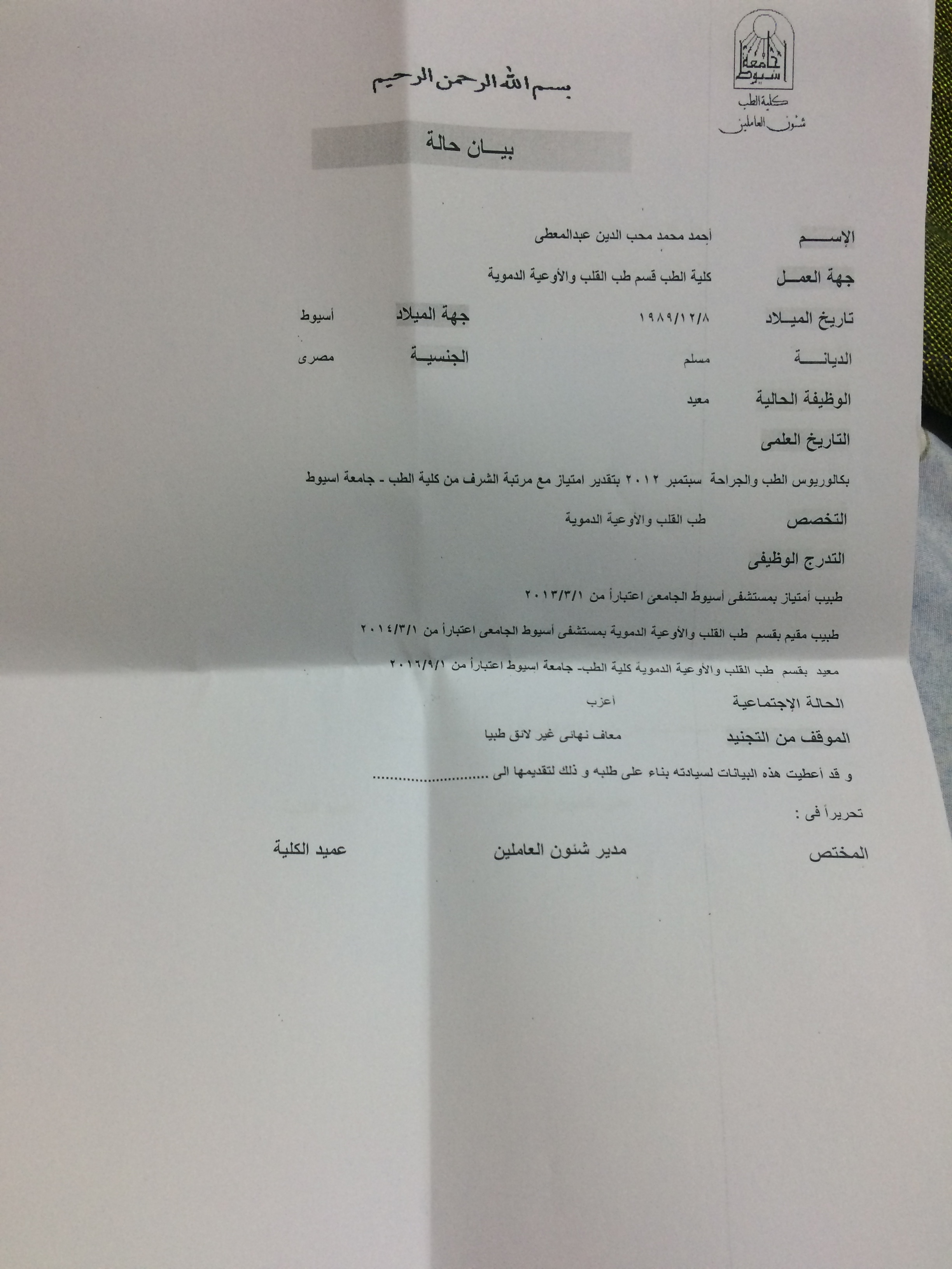 بكالوريوس ﻒﻳ امراض القلب و الاوعية الدموية () , كلية الطب جامعة اسيوط , 2012