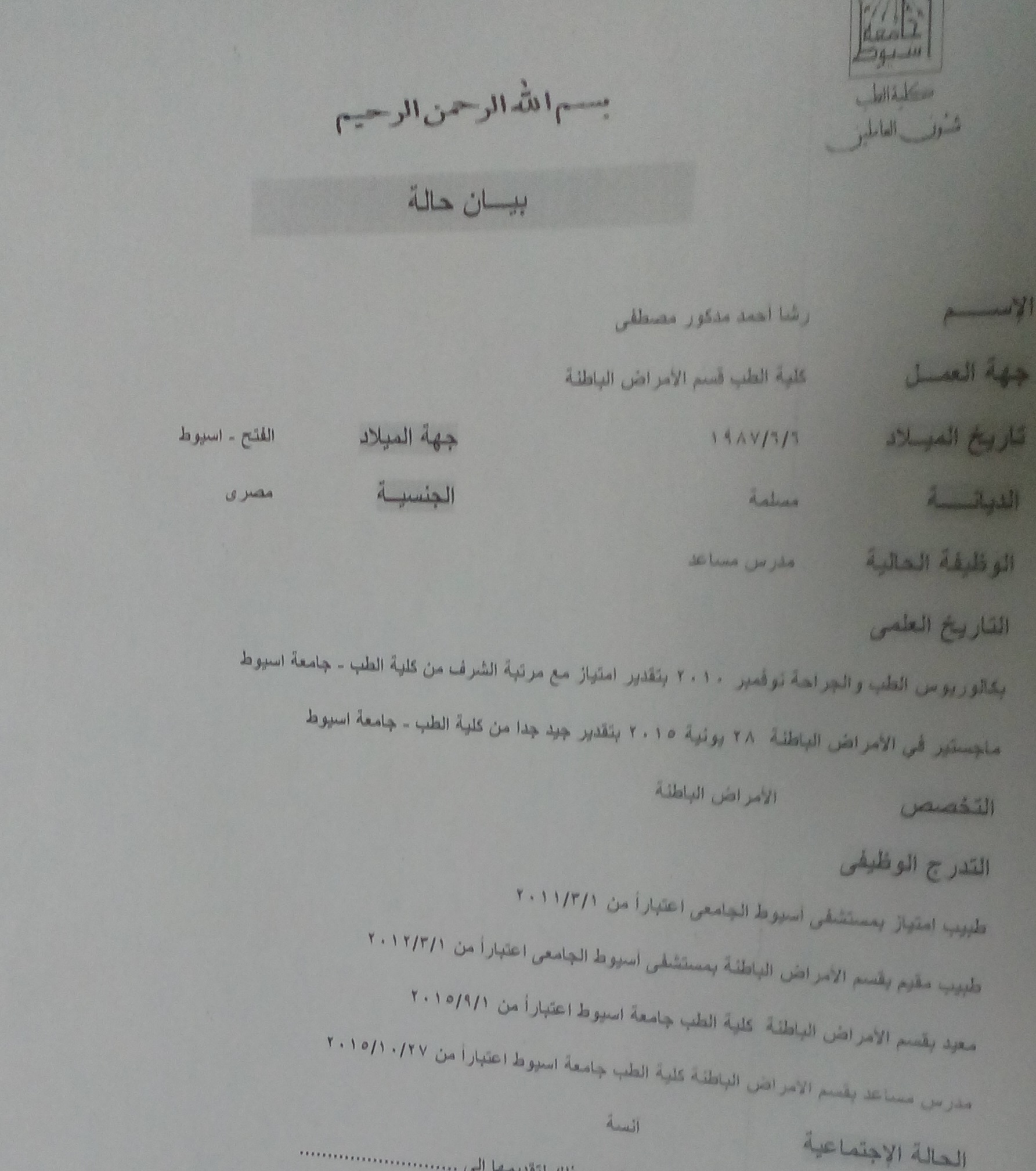 Assistant Lecturer Faculty of Medicine, ِِAssiut University , 2015